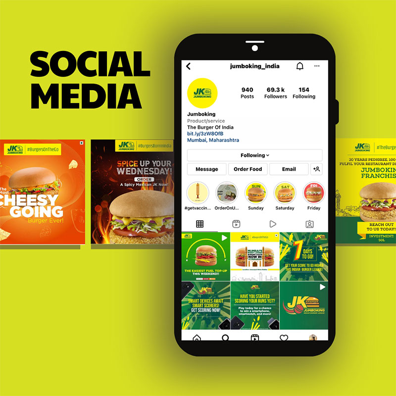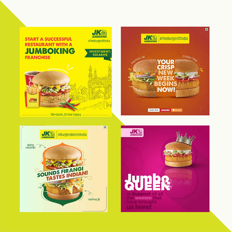 Jumbo King is a leading fast food and franchising brand in India, known for their iconic veggie burgers and expanding footprint across the country. We were approached by Jumbo King’s allied marketing agency to help them with their internal communication, social media strategy, concept development, content creation, copywriting, planning, and consultancy.